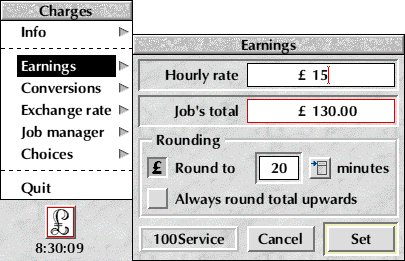 | Charges is a work manager application for monitoring time spent on jobs at the computer, and intended for people who earn a living by working at a fixed hourly rate at the computer. Multiple jobs may be handled simultaneously, each with individual settings for hourly earnings, exchange rate and so on. Charges may be used manually or can operate automatically with supporting applications, which include Ovation Pro, Sibelius 7, Rhapsody 4, Personal Accounts 4 and Prophet 3.