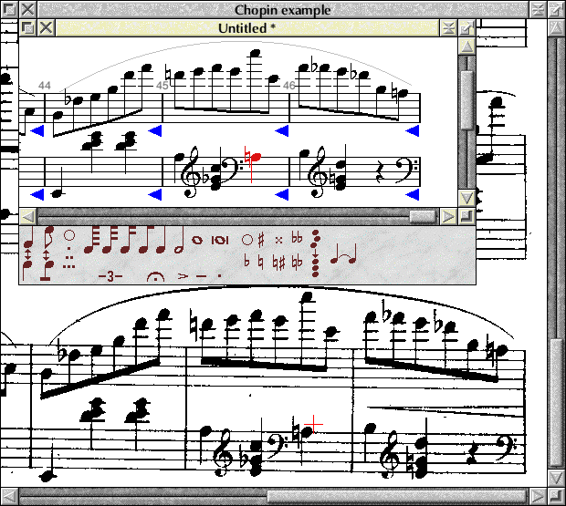 SharpEye features its own simple notation editor which allows you to correct mistakes before exporting the output into other software. A dual synchronised view of the original scanned music and the translated version, which move together as you edit the score, help you to find and correct errors easily and quickly. For more details see the SharpEye pages. (The download is a 546K Zip archive) RISC OS 5-compatible version expected soon. | ![]() (Click to view a full-size screenshot) | |